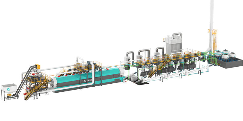 廢舊輪胎、塑料通過熱解產出燃料油、炭黑和廢鋼絲等,提供3-35噸/天處理范圍內的多種規格設備,有撬裝式、間歇式、全連續煉油設備等多種工藝可供選擇。